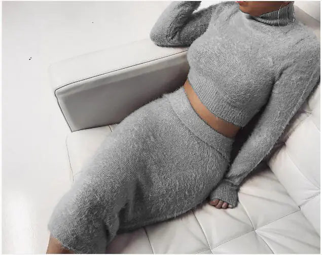 Chic Long Sleeve Women’s Sweater Set – Elegant Lotus Collar & Pencil Skirt