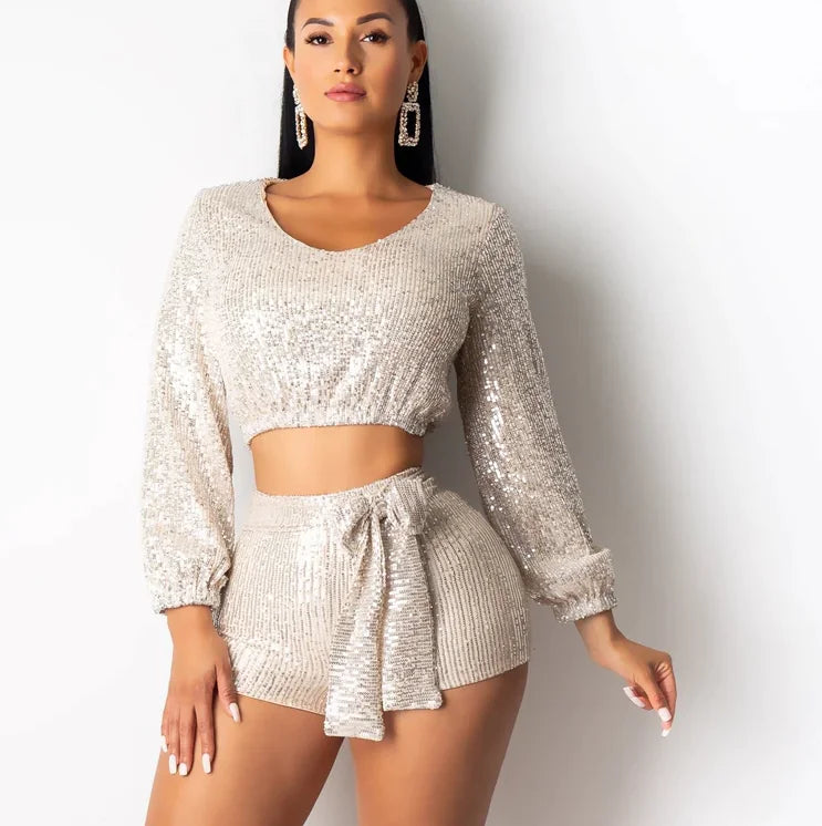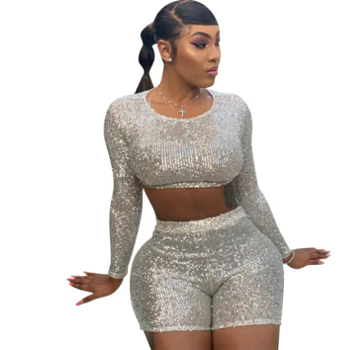 Unleash your inner diva with our Sequined Two-Piece Long Sleeve Shorts Set, designed to make you sparkle with confidence. This head-turning outfit features a long-sleeve sequin-embellished top paired with matching shorts, combining playful charm and chic sophistication.
