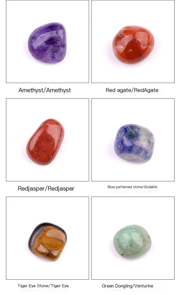 - Stones include: Amethyst (Crown), Lapis Lazuli (Third Eye), Blue Aventurine (Throat), Green Aventurine (Heart), Yellow Jade (Solar Plexus), Carnelian (Sacral), Red Jasper (Root)