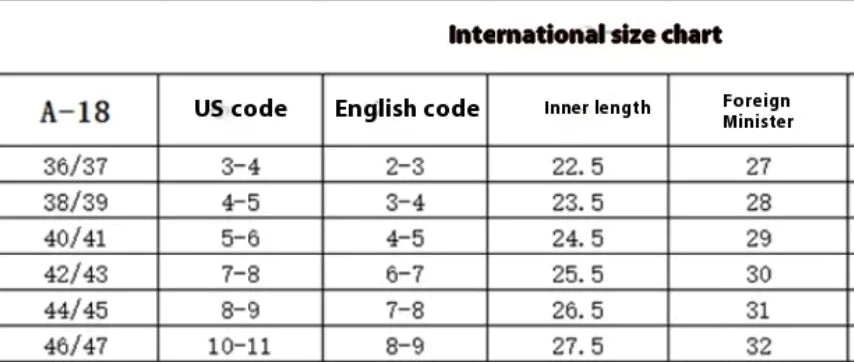- Sizes: 36–37, 38–39, 40–41, 42–43, 44–45, 46–47 (EU)