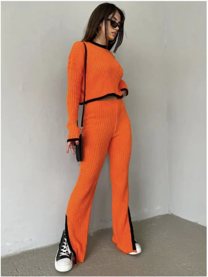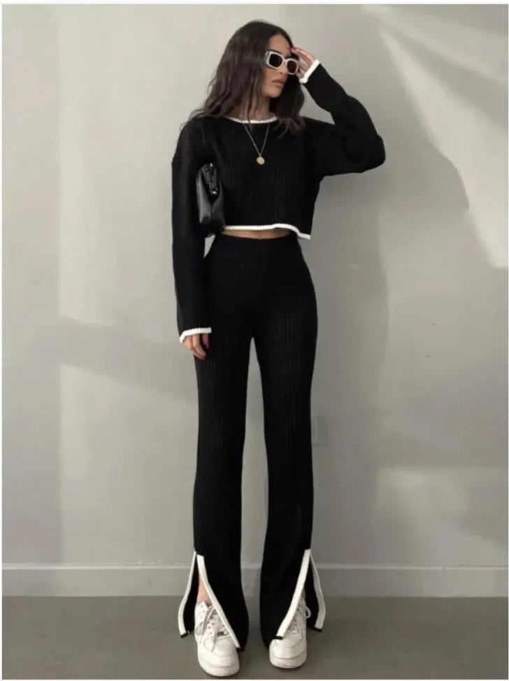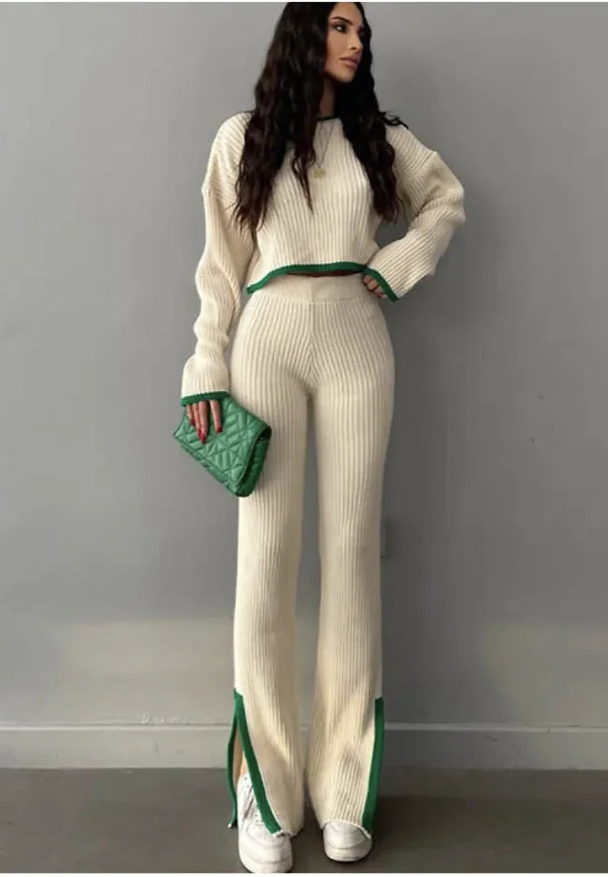 Women’s Color Block Knitted Two-Piece Set – Top & Trousers