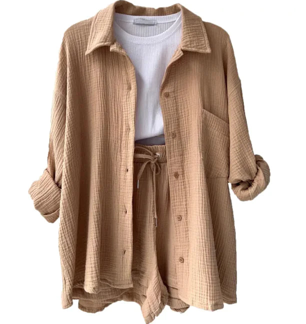 Women’s Long Sleeve Commuter Two-Piece Set – Lapel Shirt & High-Waist Shorts